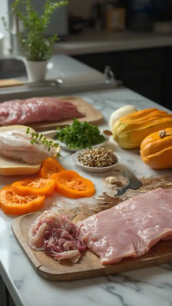 Professional kitchen scene featuring measured raw ingredients including duck meat, pumpkin, liver and supplements, neatly arranged on a marble countertop, lit naturally
