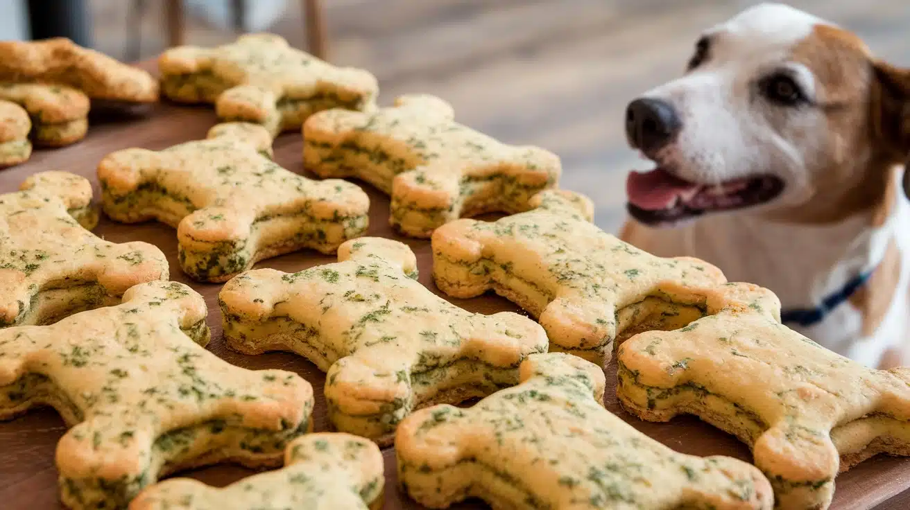 Golden-brown Mint and Parsley Dog Treats shaped with cookie cutters, with a happy dog in the background.