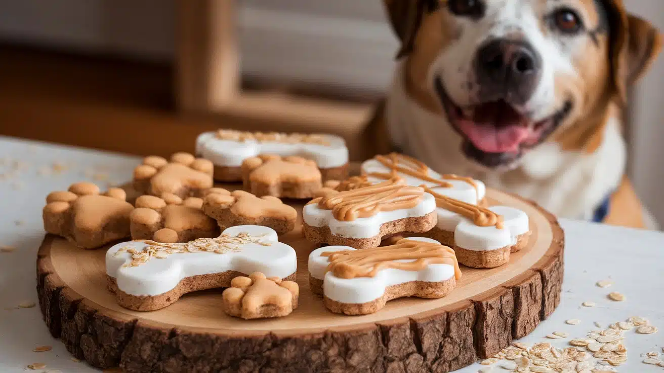 A variety of yogurt and peanut butter dog treats in fun shapes on a wooden board, with a dog waiting excitedly in the background.